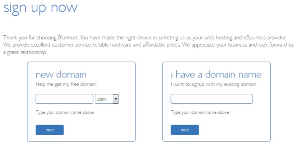 - If you already own a domain name and want to use it for your blog, type your existing domain in the right box and then click “next”. Only use the right box if you have previously paid to register a domain!